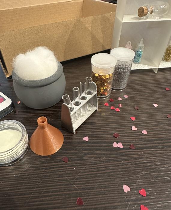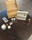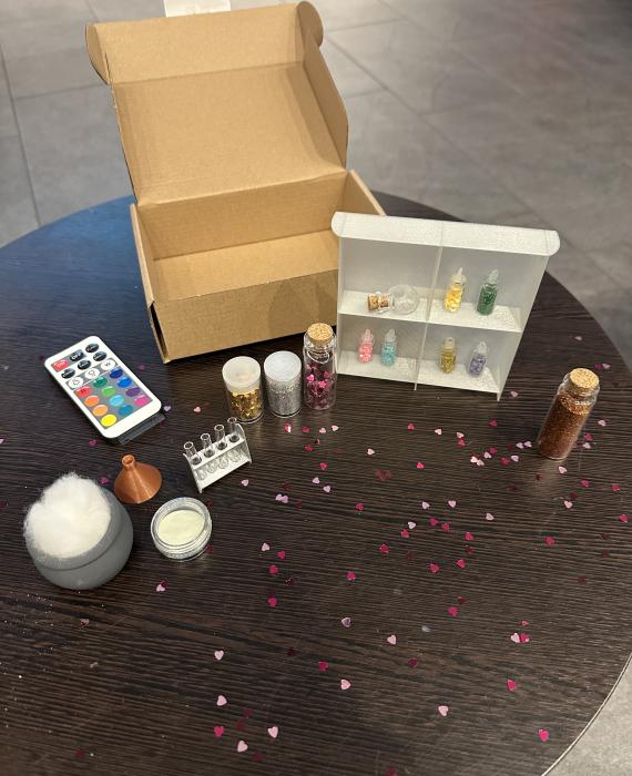 Im Set enthalten:Wichtelschrank mit GlitzerpulverZauberkessel mit LED und WattebällchenReagenzglashalter, 4 Reagenzgläser und grünem Leuchtpulver1 Trichter